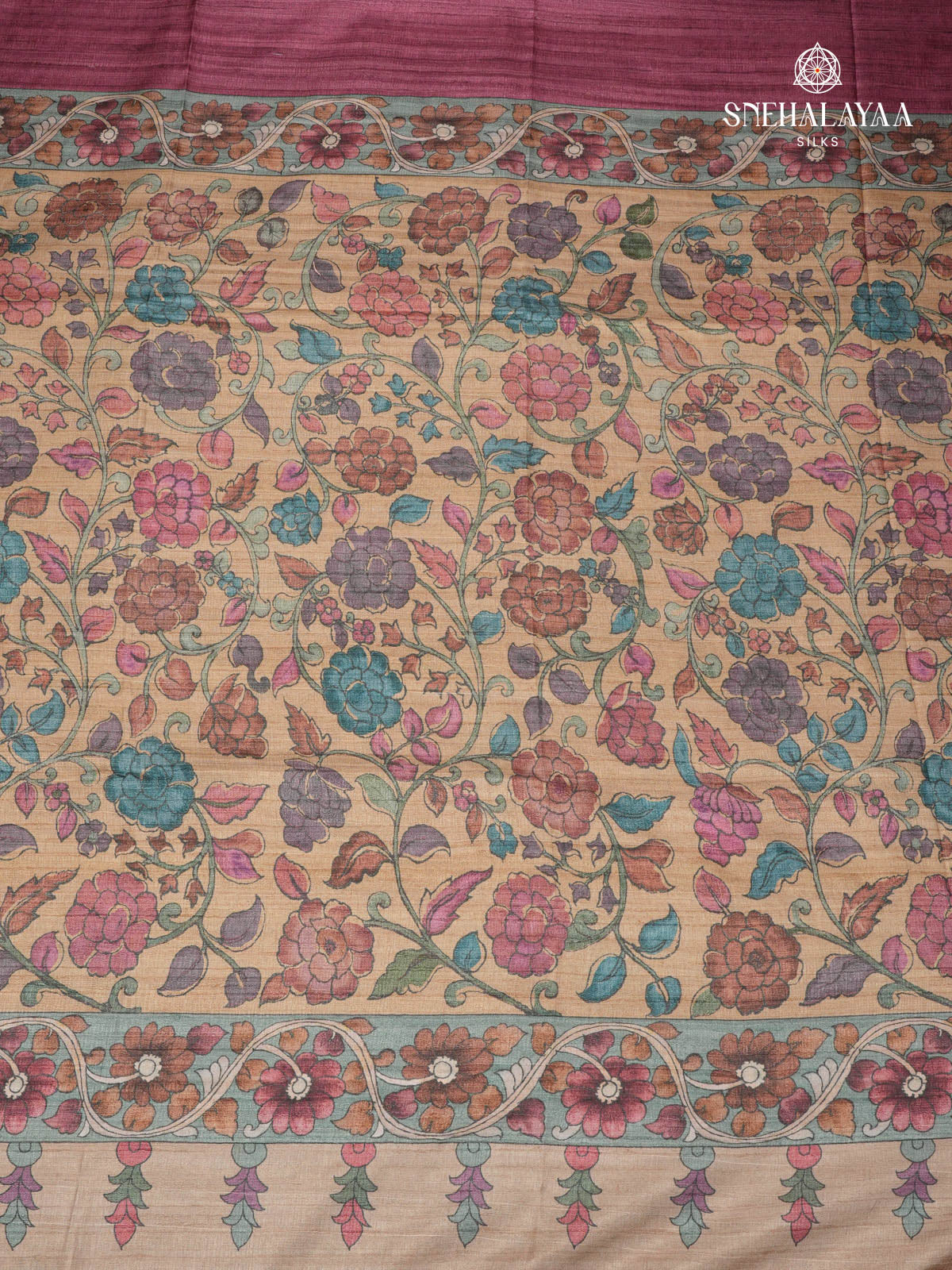 Magenta Floral Printed Tussar Saree