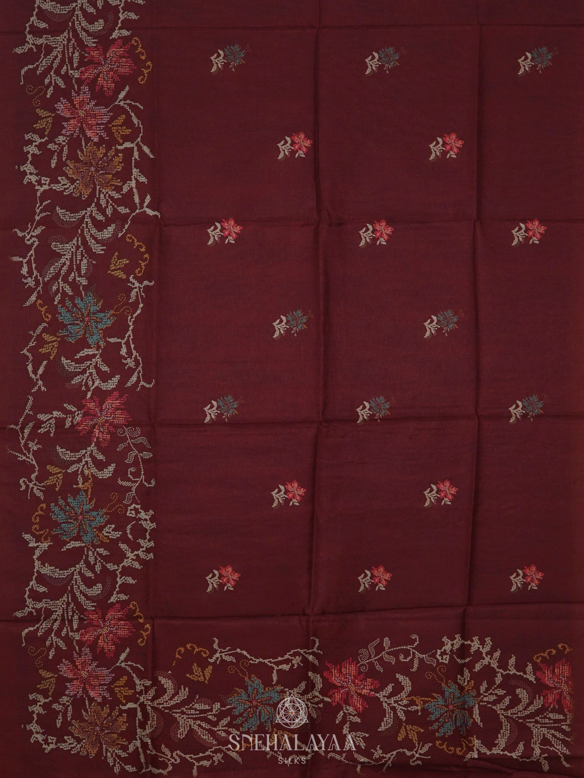 Maroon Floral Printed Tussar Saree