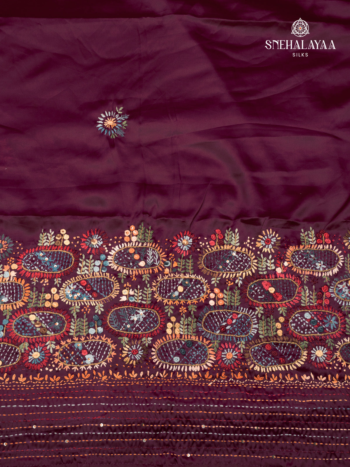 Elegant satin saree adorned with delicate floral motifs, exuding timeless charm. Finished with a beautifully embroidered border that adds a touch of sophistication.