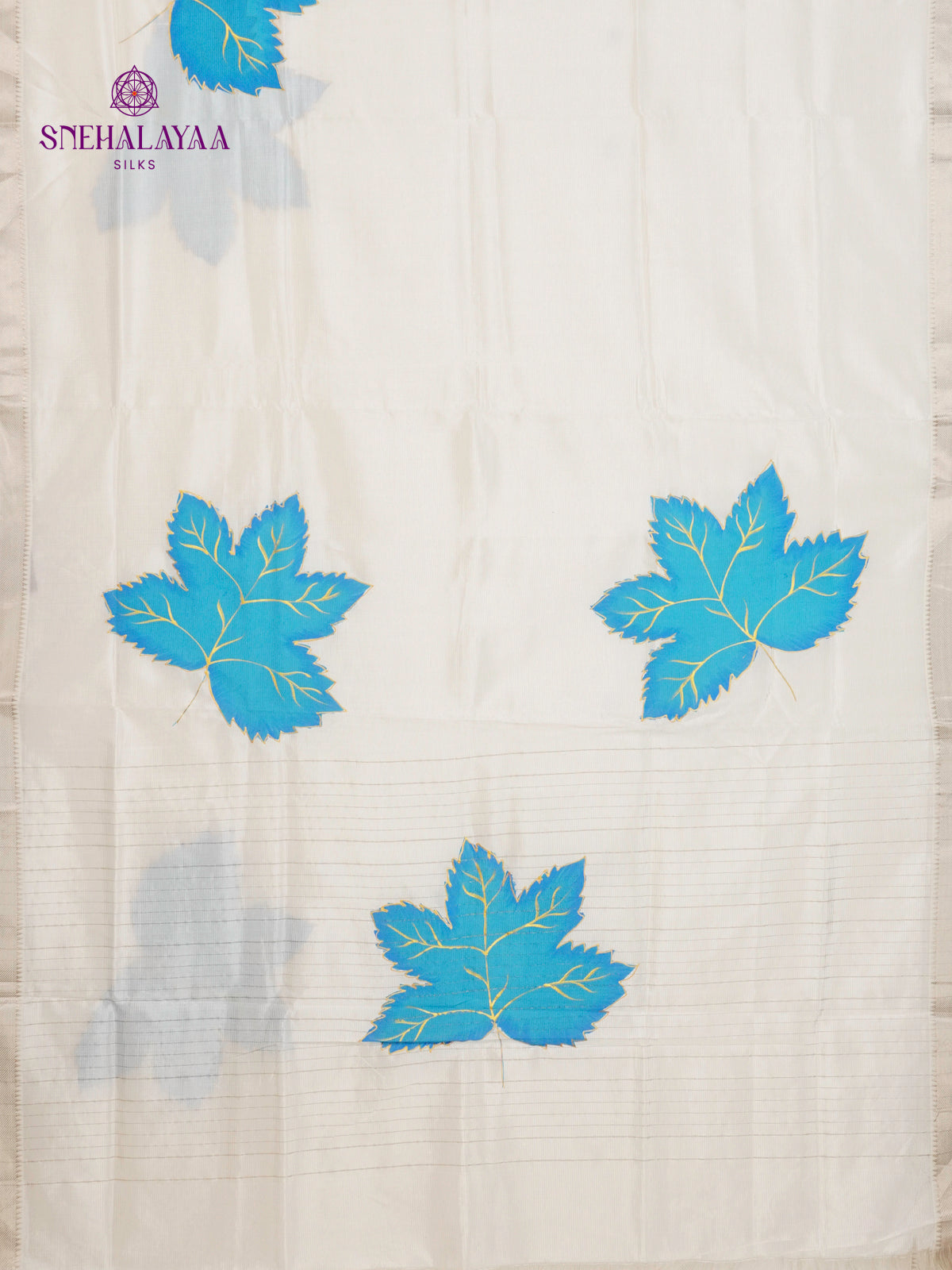 Off White Mangalagiri Silk Cotton Saree with Hand Painted Sky Blue Leaf Motifs