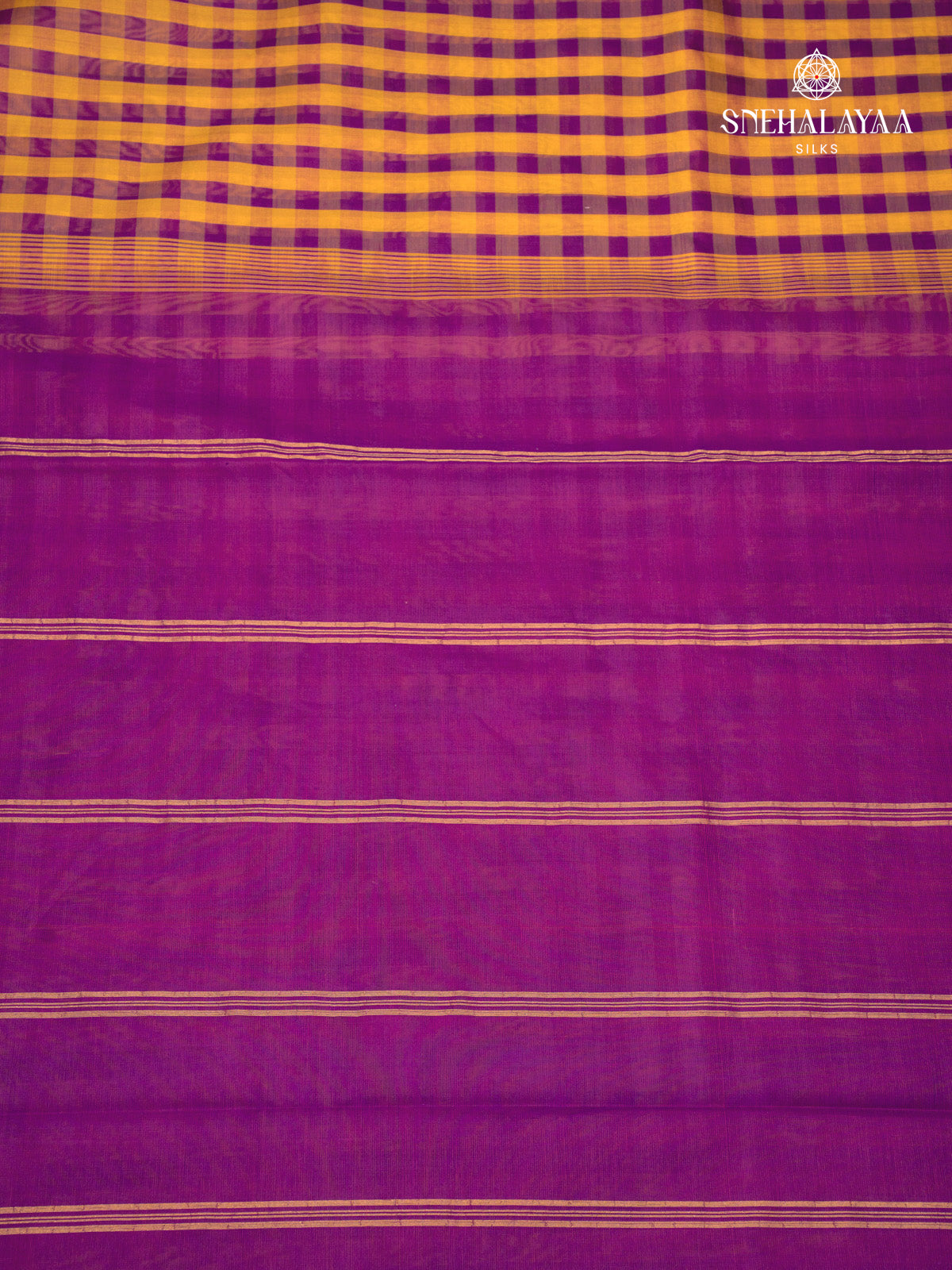 Elegant kanchi Cotton Saree featuring vibrant yellow and green checks, complemented with a traditional zari border adorned with intricate floral motifs. Lightweight and comfortable, perfect for graceful everyday wear or festive occasions.