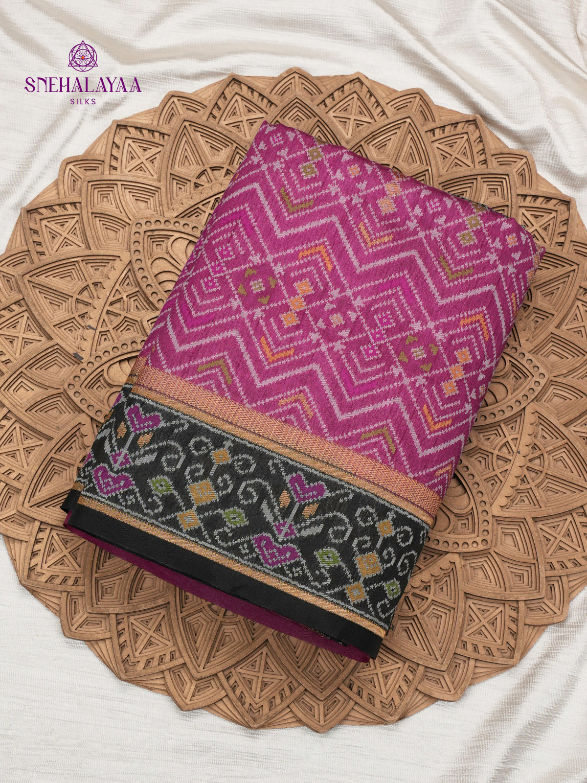 Gracefully handwoven Ikat Silk Saree featuring a striking contrast border and pallu a perfect blend of tradition and style