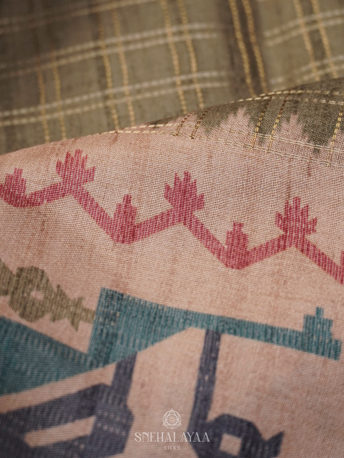 A Tussar saree features a natural golden glow and a rich, textured weave from wild silk. It reflects timeless elegance with an earthy, handcrafted appeal.
