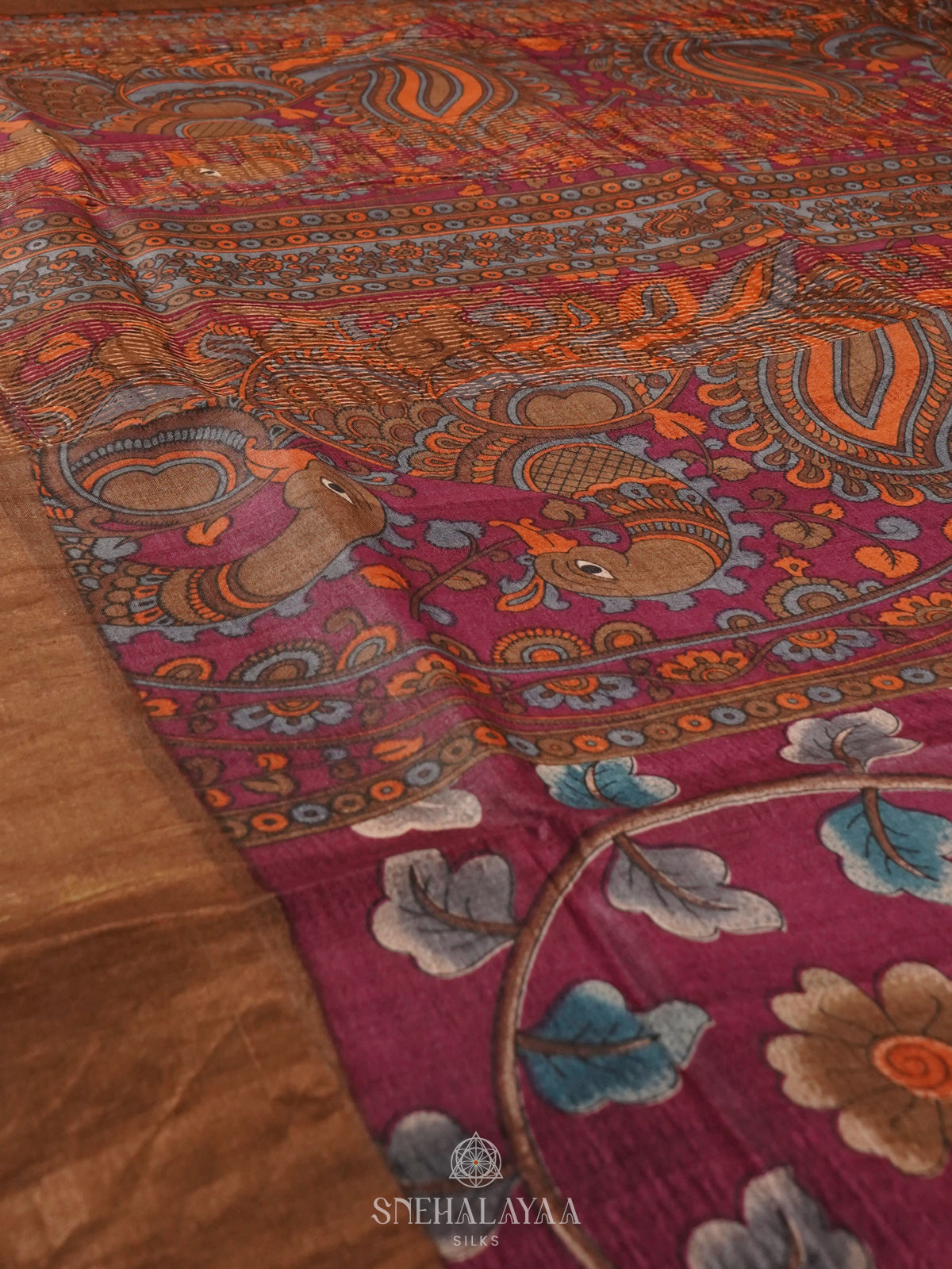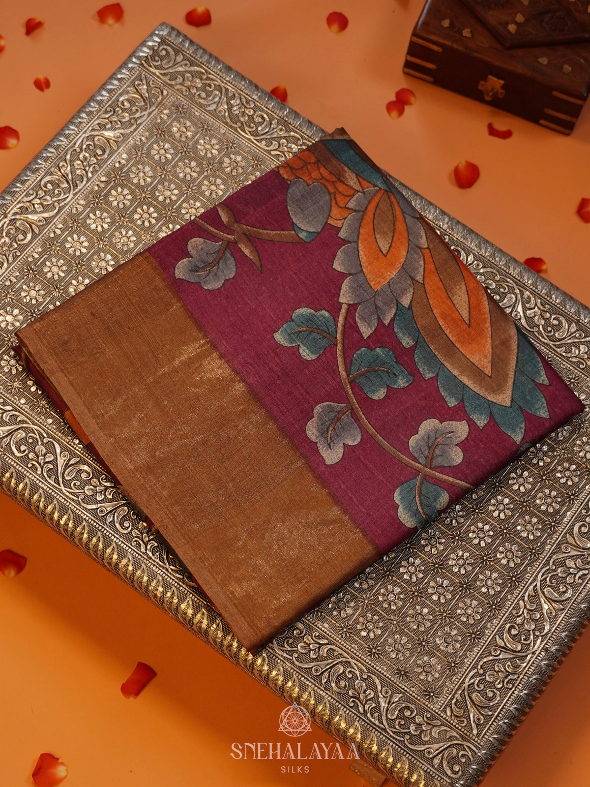 A Tussar saree features a natural golden glow and a rich, textured weave from wild silk. It reflects timeless elegance with an earthy, handcrafted appeal.