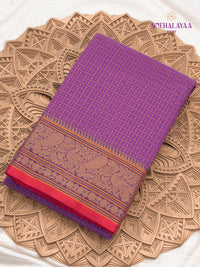 Graceful kanchi cotton saree in a rich purple hue with a subtle gold checked pattern. The striking red and beige border with peacock motifs makes it a classic choice.