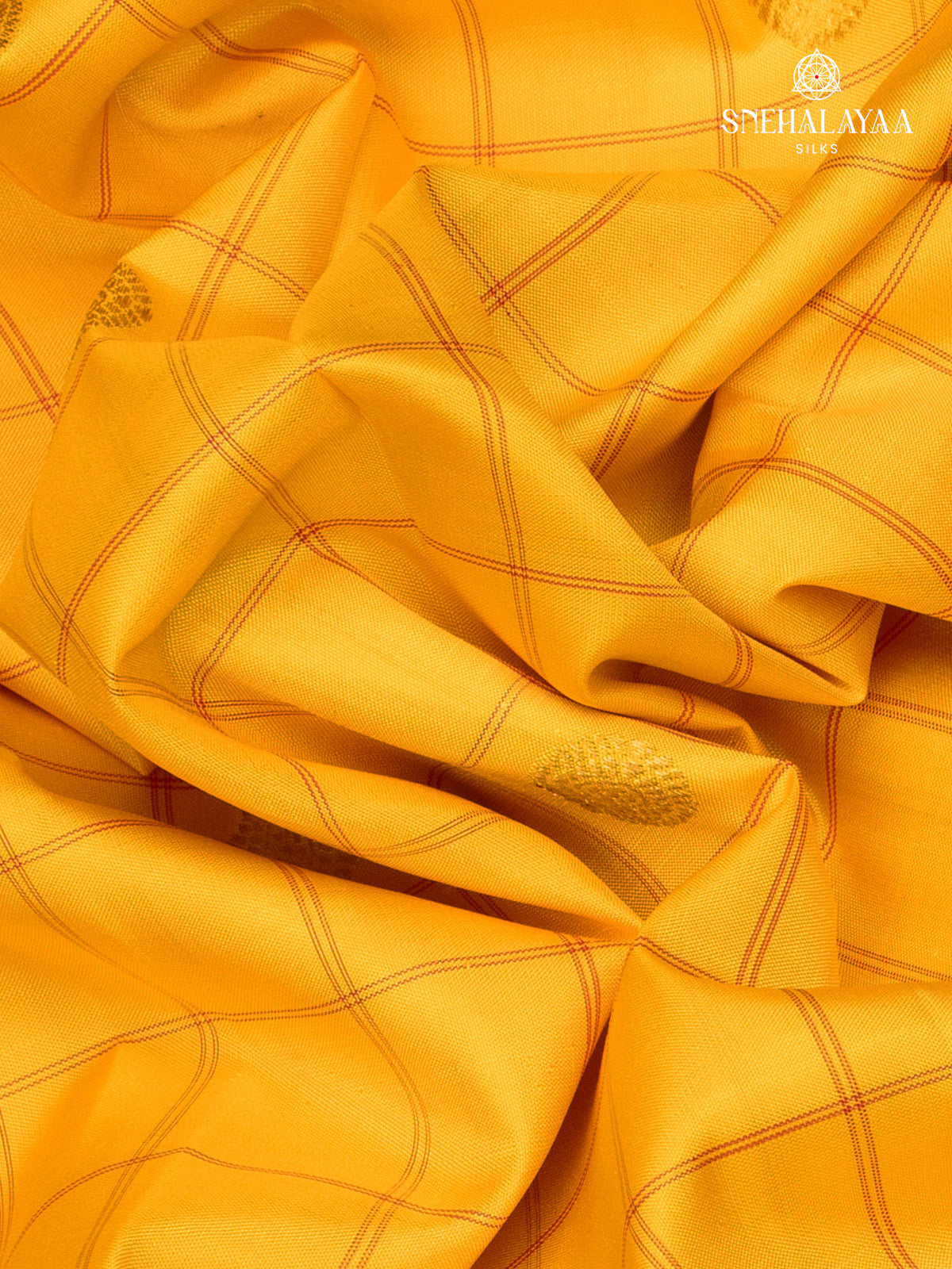 This elegant kanjivaram silk saree features classic checks adorned with charming elephant motifs, blending tradition with artistry. The contrast border and pallu add a striking and festive touch.