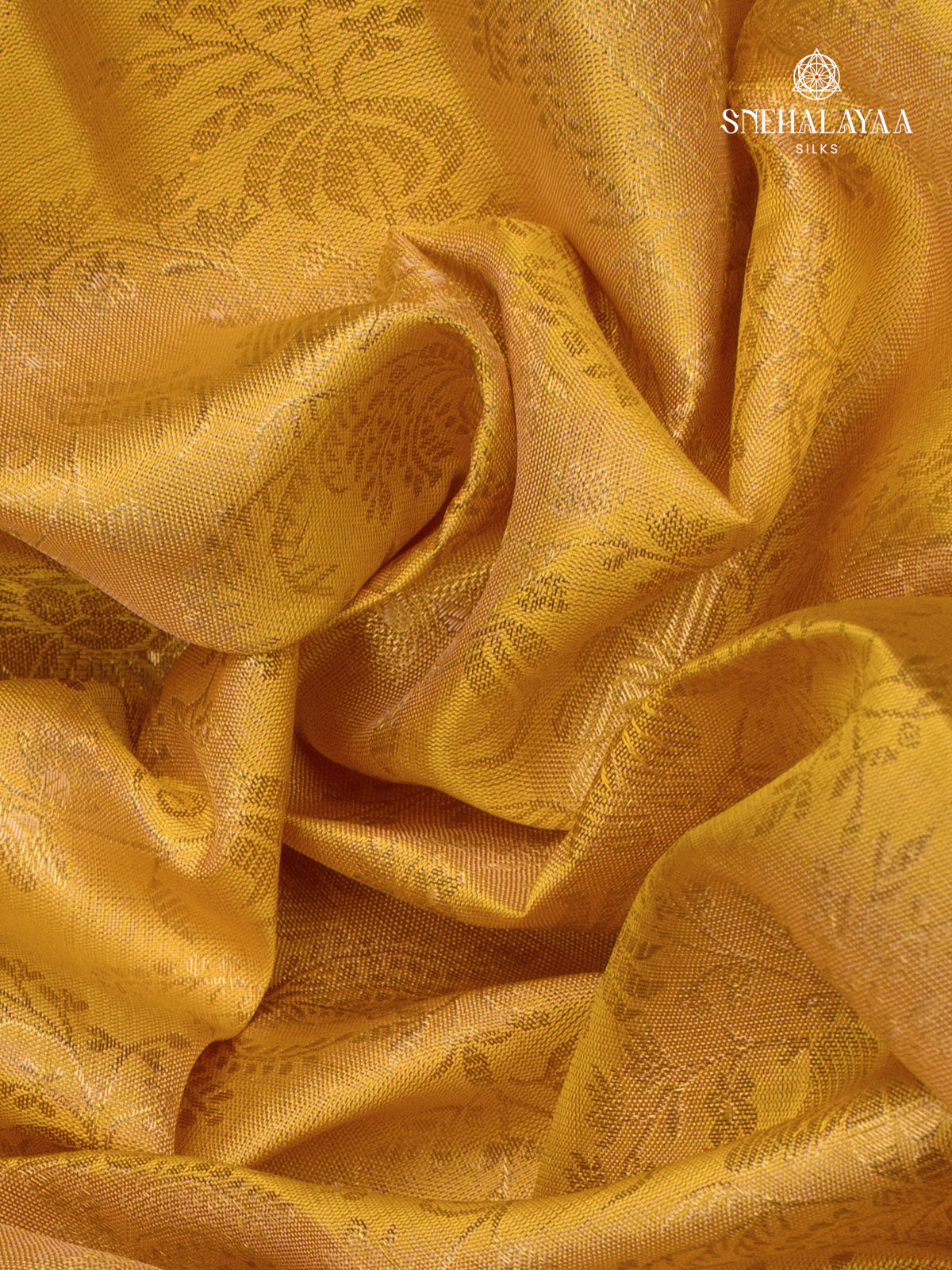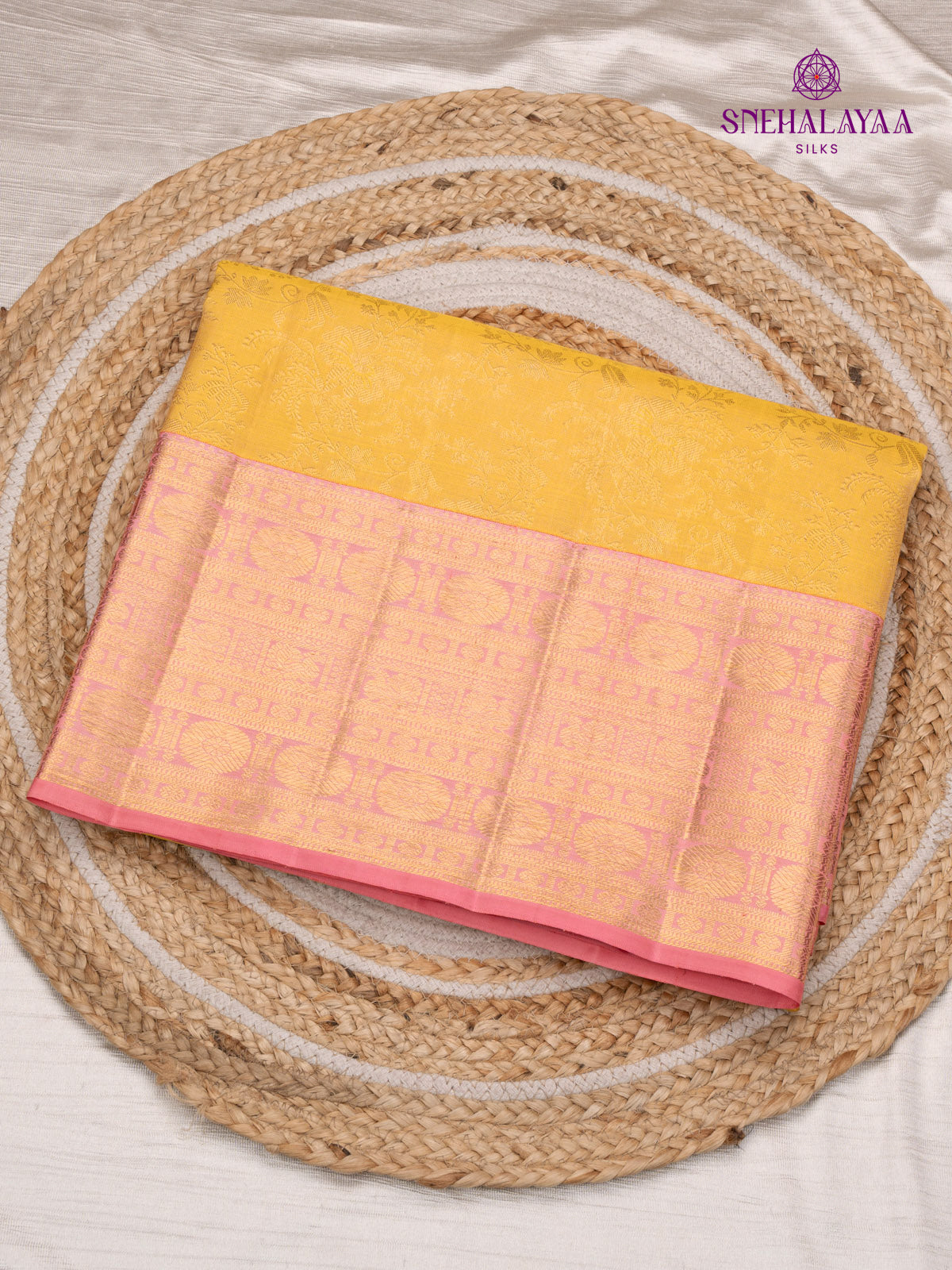 This exquisite Kanjivaram silk saree features elegant floral motifs woven intricately across the drape, exuding timeless grace. A rich contrast border enhances its beauty, adding a touch of regal sophistication.